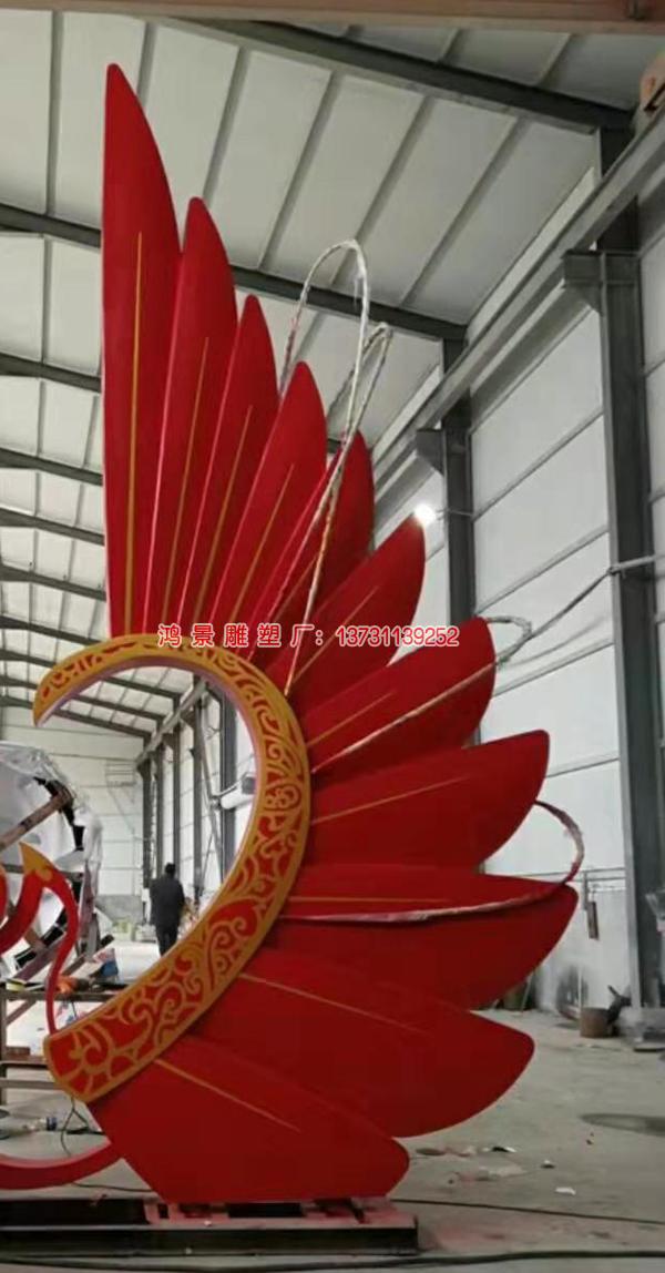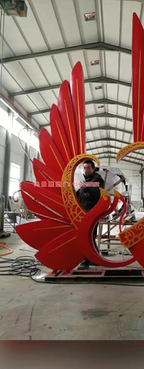 鳳凰的神瑞首先在于它是王道仁政的象征。早在上古時(shí)期,龍鳳降臨就是國家興盛、世上太平或霸業(yè)可圖的吉祥之征。“鳳凰銜書”為帝王受命立業(yè)的瑞應(yīng),“鳳凰求儀”是天下安寧、君有仁德的體現(xiàn),“丹鳳朝陽”則比喻賢才遇時(shí)。 古人以龍代表皇帝,以鳳代表皇后、皇太后,于是鳳又為帝王或皇家重用,如“鳳邸”為帝王即位前的舊居,“鳳車”、“鳳輦”都是帝王乘坐之車,“鳳冠”為皇后之冠,皇帝詔書為“鳳詔”,治國的人才會聚之所稱為“鳳穴”,得知不易的稀世之才或珍惜之物稱為“鳳毛麟角”等。民間視金鳳凰為吉祥的象征,稱夫妻和諧、生活美滿為“鸞鳳和鳴”。民間鳳凰的形象多用于婚禮或婦女服飾上,如“鳳轎”、“鳳帔”、“鳳冠”、“鳳釵”、“鳳頭鞋”等。 鳳穿牡丹由鳳凰與牡丹花組合構(gòu)圖,“鳳穿牡丹”又名“鳳戲牡丹”。鳳凰是百鳥之王;牡丹為花中之王,又稱“富貴花”,有富貴、祥瑞、美化的寓意。鳳穿牡丹是生命生育的主題,同時(shí)寓意吉祥、富貴、和諧。在現(xiàn)代鳳凰雕塑用不銹鋼材質(zhì)來制作數(shù)不勝數(shù),各種形姿百態(tài)的造型出現(xiàn)在我們眼簾,來供游客參觀欣賞。