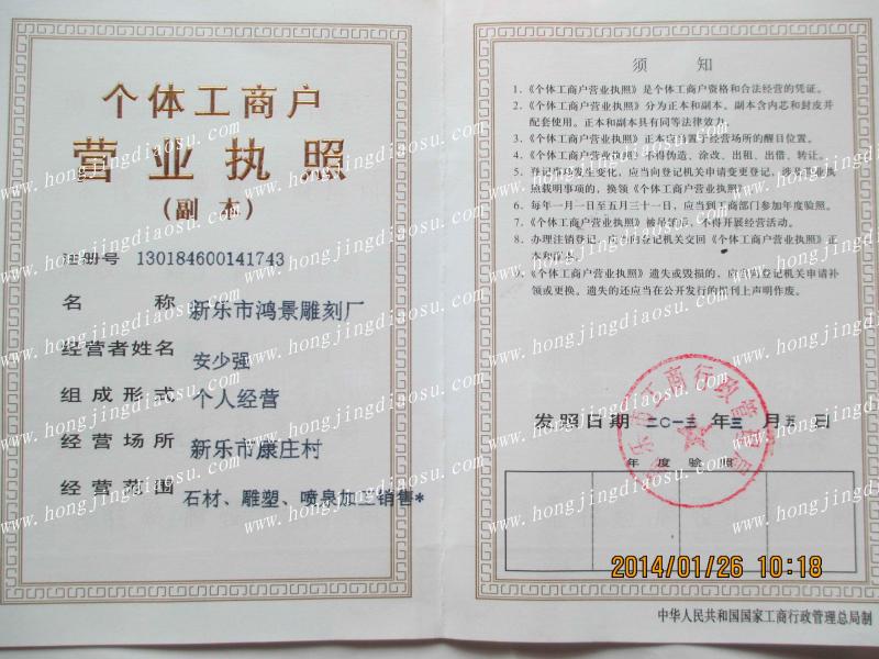 營業執照是榮譽資質的一種分類。石家莊鴻景不銹鋼雕塑廠專業制作各種營業執照,如有需要營業執照歡迎聯系我們,我們免費為您提供營業執照圖片,營業執照價格等相關信息。營業執照圖片由石家莊鴻景不銹鋼雕塑廠2014年09月22日上傳,歡迎撥打鴻景雕塑公司電話,我們為您提供更多的營業執照資料信息。石家莊鴻景不銹鋼雕塑廠推薦查看跟營業執照相關的產品信息: